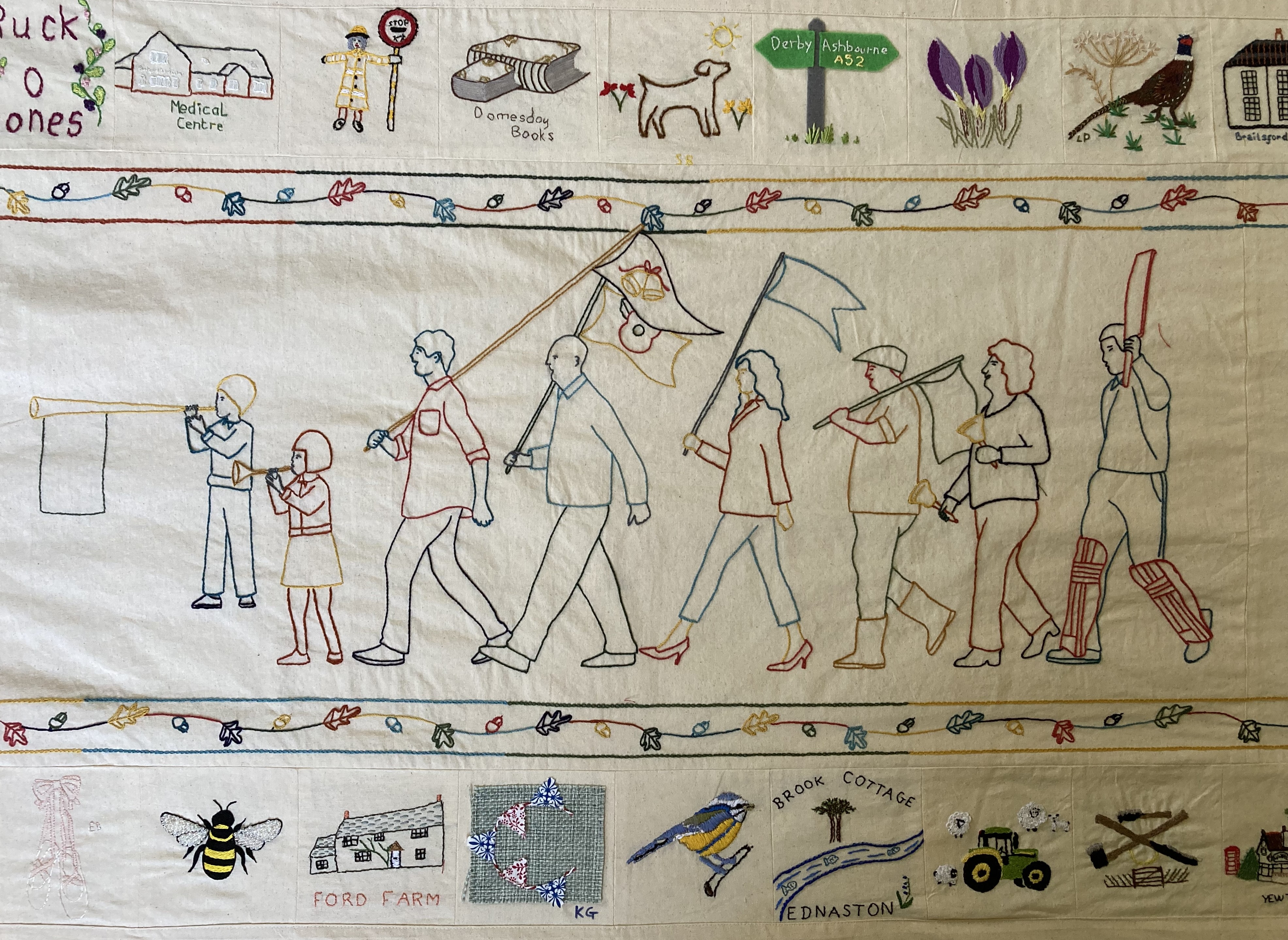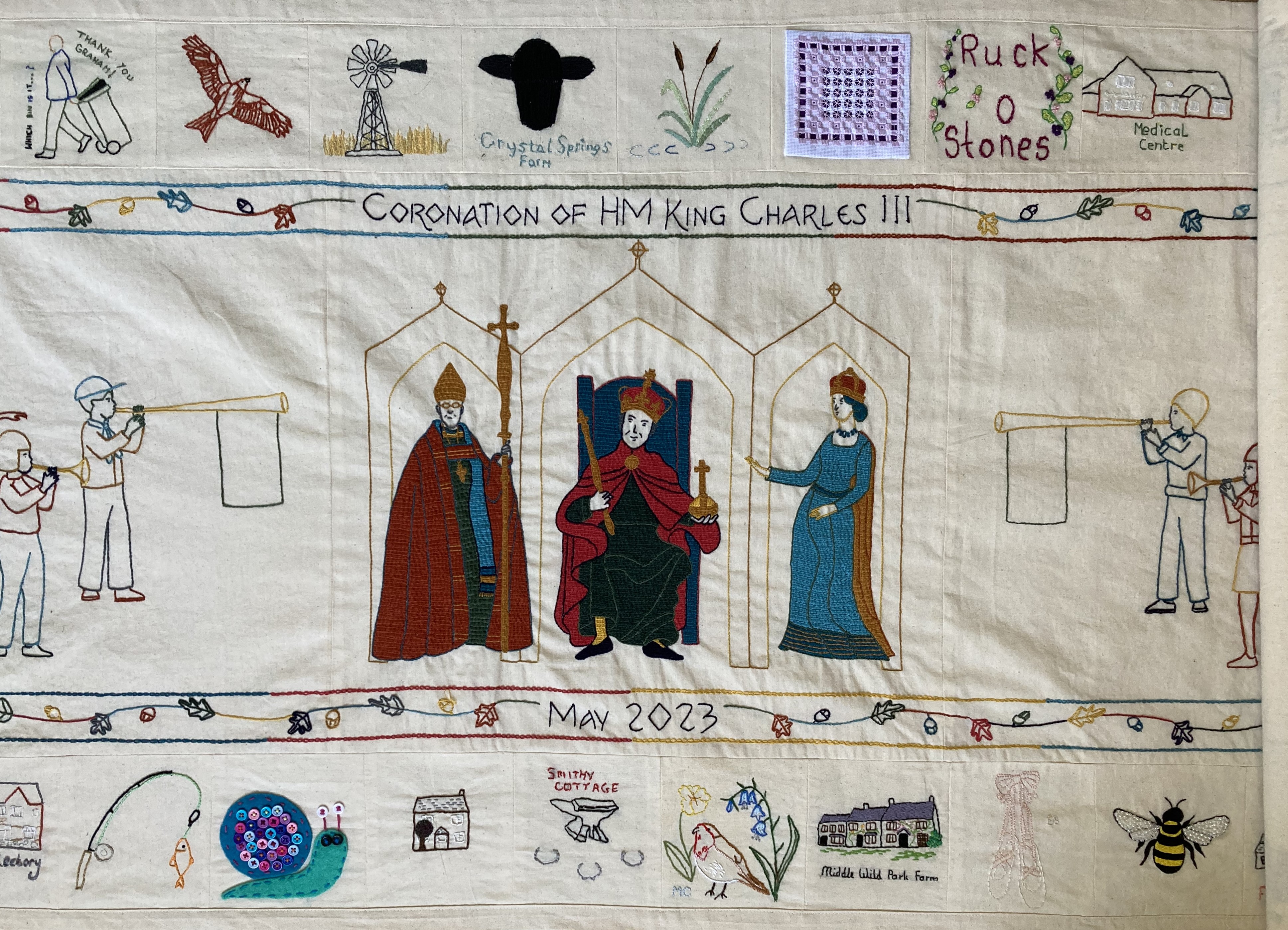 The aim was to create a narrative embroidery inspired by the Bayeux Tapestry which documented the crowning of King Charles III and celebrated the wonderful but changing rural villages of Brailsford and Ednaston.